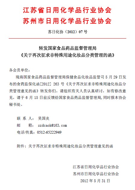 蘇日化協[2012]07號 轉發國家食品藥品監督管理局《關于再次征求非特殊用途化妝品分類管理的函》