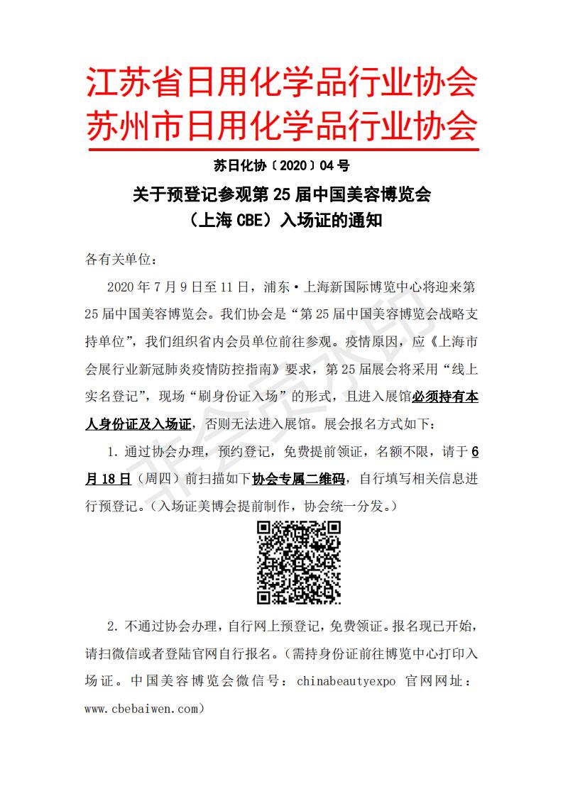 關于預登記參觀第25屆中國美容博覽會 (上海CBE)入場證的通知