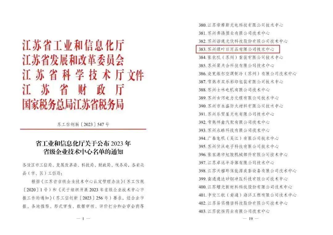 近日,根據(jù)《江蘇省省級企業(yè)技術(shù)中心認(rèn)定管理辦法》(蘇工信規(guī)〔2020〕1號)和《關(guān)于組織開展 2023 年省級企業(yè)技術(shù)中心申報工作的通知》(蘇工信創(chuàng)新〔2023〕256號)要求,綠葉科技集團(tuán)企業(yè)技術(shù)中心經(jīng)過企業(yè)申報、各地推薦、 形式審查、數(shù)據(jù)審核、評價打分和會審會商等程序,現(xiàn)已被江蘇省工業(yè)和信息化廳認(rèn)定為省級企業(yè)技術(shù)中心。